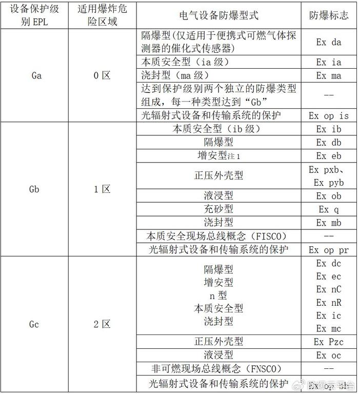 注1:在1區(qū)Gb中使用的“eb”型電氣設備僅限于下列電氣設備:在正常運行中不產生火花、電弧或危險溫度的接線盒和接線箱,包括主體為“db”或“mb”型,接線部分為“eb”型的電氣產品;配置有合適熱保護裝置的“eb”型低壓異步電動機(頻繁和環(huán)境條件惡劣者除外);“eb”型熒光燈。