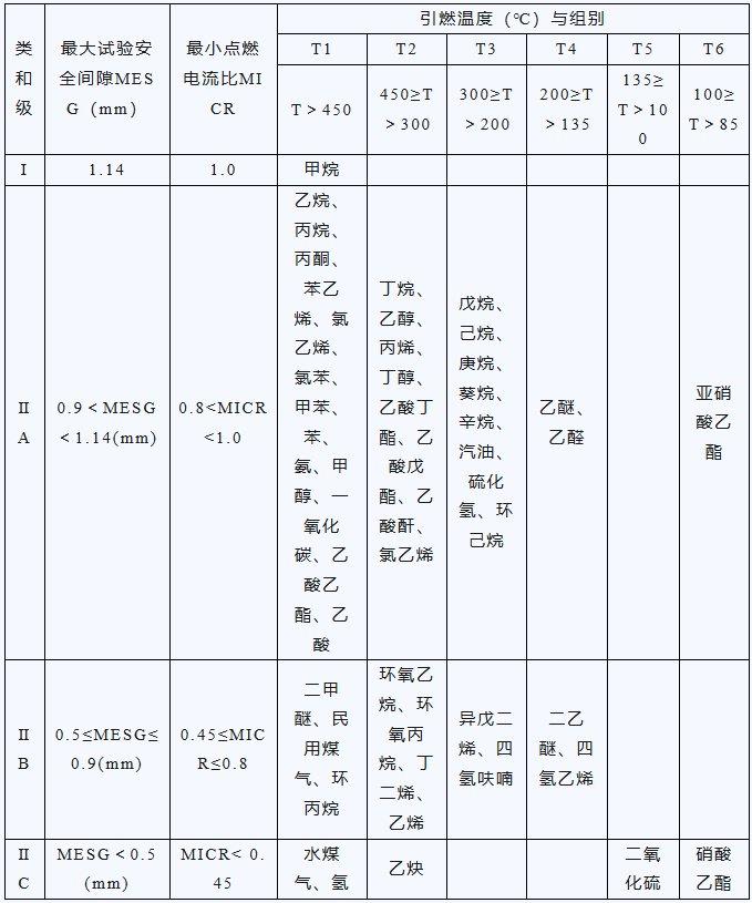 要根據(jù)危險環(huán)境可能存在的可燃性氣體/蒸氣的種類來選擇防爆電氣設備的級別和溫度組別。電氣設備應按其最高表面溫度不超過可能出現(xiàn)的任何氣體或蒸氣的引燃溫度選型,電氣設備必須在被標志的溫度范圍內使用。